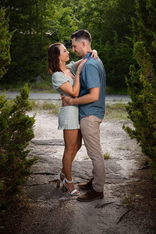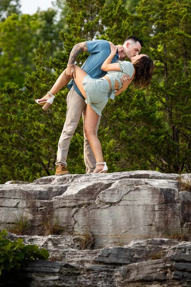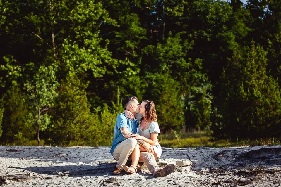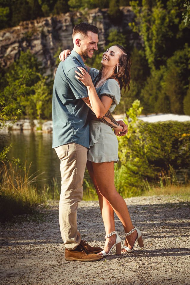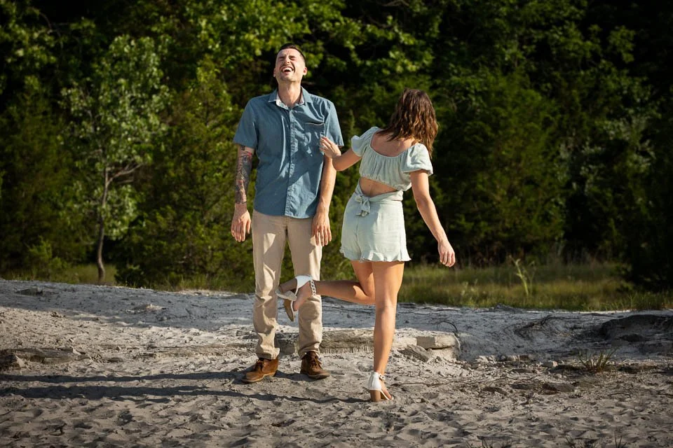 Gabby and Brian wanted to have their engagement session at Klondike Park in St. Charles County. This former quarry was transformed into a breathtaking landscape featuring white sand, dramatic cliffs, a serene lake, and lush greenery—all creating a stunning backdrop for their romantic photos.